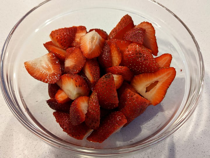 As you might be picking up, berry size is a source of contention for me. In the 1960s and 70s, you could buy pints of small, sweet, dark red through and through strawberries. The only way to buy strawberries now is in quart containers, because, you guessed it, the strawberries are modified with fertilizer and breeding, to be huge. And tasteless. I prefer small to medium-sized, beautiful glossy, all-over ruby fruits sprinkled with little brown seeds, with no hint of white, off-white, cream, sand, or alabaster near their crowns or green variations near the stems. The ones that come, say, 15-20 to a pint. This UC Davis article written in 1963 and updated in 2016 is a fascinating history about the strawberry economy from pre-WWII to the early 60s. Mexican competition, the rise of the frozen strawberries, fertilizer, managing a very perishable fruit, and more, created a social environment for the conundrum we are in now. Unfortunately, it seems, as consumers wanted strawberries year-round, we have to go with large, tougher strawberries so they can travel across the continent with ease.
