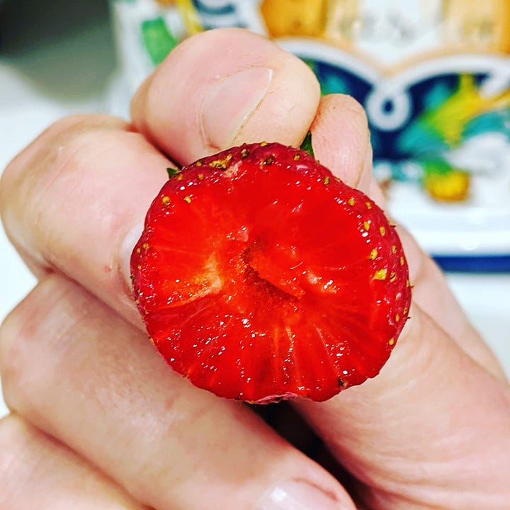 What is most important? The inside. Sometimes I think we forget the beauty of a real strawberry grown in its season and terroir and not over-fertilized or watered for rapid growth, then picked before it is fully ripe so it travels well, is the real gem. The fully crimson interior and sweet, strawberry taste are just sublime. I would hate to think over time we will not know what a strawberry taste really is.