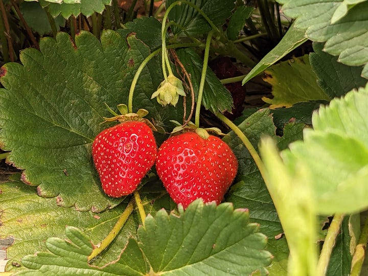 The best strawberries seemed to be in the shade of the plant and the bindweed. I looked carefully for those special “first” berries. They could be hidden near the roots of the plant – not glowing red in the bright sun, which is another reason why strawberry growers like those giant specimens – so workers don’t have to look too hard for the fruit and can move faster and thus, earn more. Finally, producers can improve their bottom line by offering fewer, larger, firmer, unripe strawberries in a plastic box.